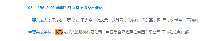 《新型光纖制備技術(shù)及產(chǎn)業(yè)化》主要完成單位:長(zhǎng)飛光纖光纜股份有限公司,中國(guó)聯(lián)合網(wǎng)絡(luò)通信集團(tuán)有限公司 工業(yè)和信息化部。主要完成人:王瑞春,羅杰,王光全,韓慶榮,龍勝亞,朱繼紅,張磊,楊晨,沈世奎,王潤(rùn)涵,張方海。