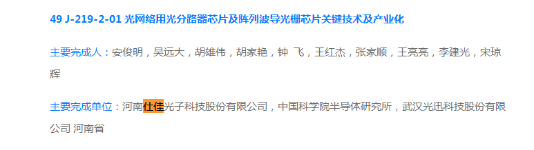 《光網(wǎng)絡(luò)用光分路器芯片及陣列波導(dǎo)光柵芯片關(guān)鍵技術(shù)及產(chǎn)業(yè)化》主要完成單位:河南仕佳光子科技股份有限公司、中國(guó)科學(xué)院半導(dǎo)體所、武漢光迅科技科技股份有限公司 河南省。主要完成人:安俊明,吳遠(yuǎn)大,胡雄偉,胡家燕,鐘飛,王紅杰,張家順,王亮亮,李建光,宋瓊輝。