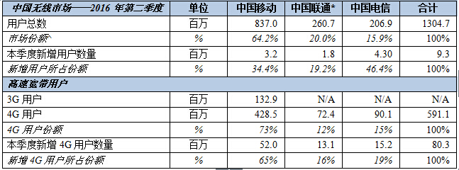 (注:中國聯(lián)通報告的使用包月計劃的移動用戶;不包括移動虛擬網(wǎng)絡(luò)運營商)