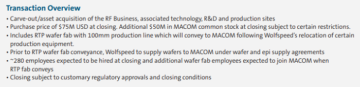MACOM將以1.25億美元的價格收購該射頻業(yè)務(wù),其中包括在交易結(jié)束時支付的7500萬美元現(xiàn)金和價值5000萬美元的MACOM普通股。約280名員工預(yù)計將在交易完成時加入MACOM,另有員工將在RTP工廠搬遷后加入。