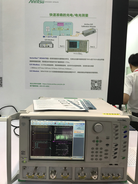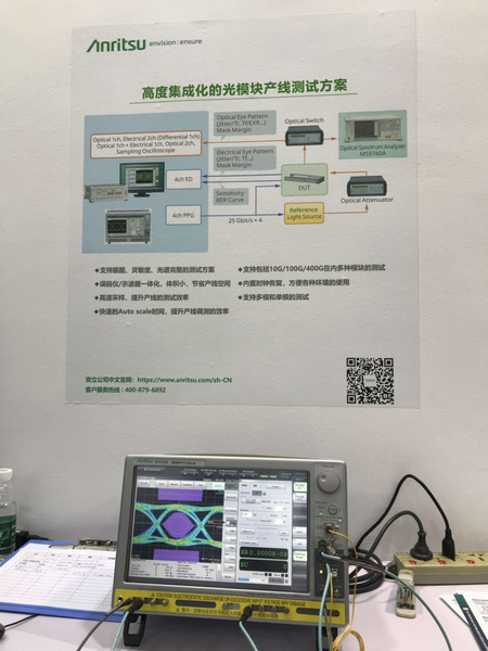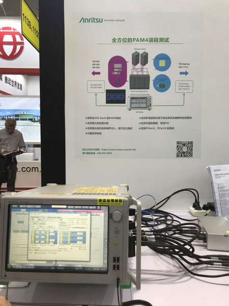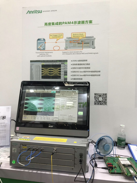 MP2110A 是一款內(nèi)置誤碼率測試儀 (BERT) 和采樣示波器的一體化測量儀器,支持光模塊的BER測量、眼圖模板測試、眼圖分析等評估操作。就在本周,MP2110A的采樣示波器上剛升級了PAM4分析功能,在之前26 Gbaud基礎(chǔ)上引入了53 Gbaud PAM4分析功能。本次展臺上也專門準備了相應(yīng)的實際演示。