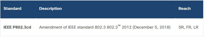 所有產(chǎn)品均符合相關(guān)的IEEE標(biāo)準(zhǔn)(見表 3)。一定程度上,它們與其他采用IEEE標(biāo)準(zhǔn)的25G和50G接口實(shí)現(xiàn)互操作。每個(gè)產(chǎn)品都在Cisco® SFP56端口上經(jīng)過測(cè)試和認(rèn)證,以保證性能和可靠性。
