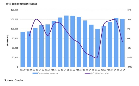 ICC訊(編譯:Nina)根據(jù)Omdia的最新報(bào)告數(shù)據(jù),2024年第一季度,半導(dǎo)體市場(chǎng)下降了約2%,降至1515億美元。通常情況下,在經(jīng)歷了第四季度的強(qiáng)勁季節(jié)性需求之后,第一季度市場(chǎng)會(huì)表現(xiàn)低迷,收入會(huì)下滑4.4%。2024年第一季度,半導(dǎo)體市場(chǎng)的大部分板塊都出現(xiàn)下滑。消費(fèi)板塊(Consumer)受到的打擊最大,較去年第四季度下降10.4%;而由于庫存調(diào)整,工業(yè)板塊(Industrial)下降8.5%;即使是多年來保持穩(wěn)定增長(zhǎng)的汽車板塊(Automotive),也在2024年第一季度出現(xiàn)了5.1%的負(fù)增長(zhǎng)。這些板塊的下降被數(shù)據(jù)處理板塊(Data processing)的季度增長(zhǎng)所抵消,該板塊增長(zhǎng)了3.7%,這是市場(chǎng)對(duì)英偉達(dá)芯片和其他人工智能相關(guān)產(chǎn)品的持續(xù)高需求所推動(dòng)的。