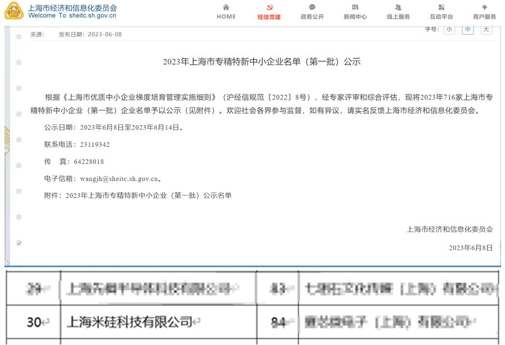 ICC訊 2023年6月,上海市經(jīng)濟(jì)和信息化委員會(huì)對(duì)“專精特新”中小企業(yè)認(rèn)定情況進(jìn)行了公布。上海米硅科技有限公司被認(rèn)定為上海市“專精特新中小企業(yè)”。
