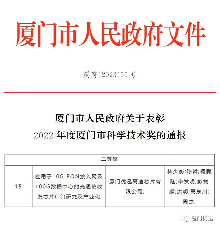 3月29日,2022年度廈門市科學(xué)技術(shù)獎(jiǎng)獲獎(jiǎng)名單揭曉,廈門優(yōu)迅高速芯片有限公司“應(yīng)用于10G PON接入網(wǎng)及100G數(shù)據(jù)中心的光通信收發(fā)芯片(IC)研究及產(chǎn)業(yè)化”項(xiàng)目榮獲科學(xué)技術(shù)進(jìn)步獎(jiǎng)二等獎(jiǎng)。