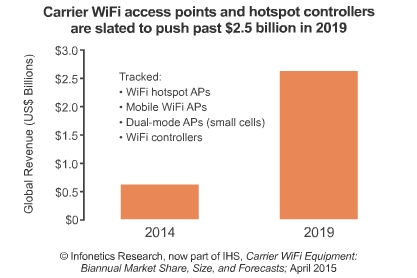 ICCSZ訊 日前,市場調(diào)研公司Infonetics發(fā)布關(guān)于運(yùn)營商WiFi設(shè)備市場報(bào)告。2014年下半年在中國移動(dòng)的驅(qū)動(dòng)下,全球運(yùn)營商WiFi市場環(huán)比上半年增長23%,到達(dá)3.36億美元。Infonetics預(yù)計(jì)2015年運(yùn)營商WiFi市場將大幅增長。