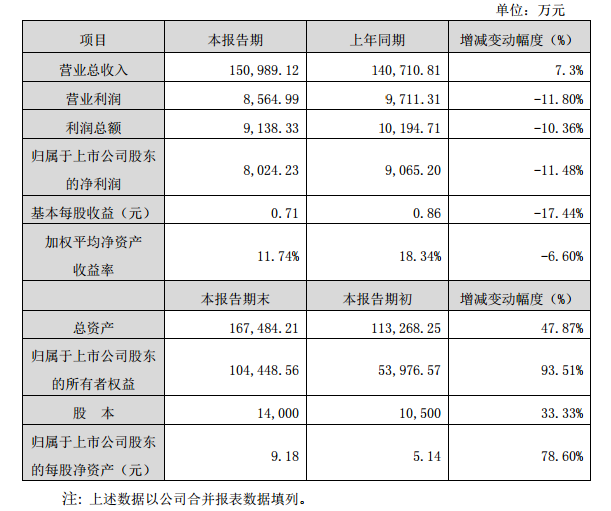 該快報(bào)預(yù)計(jì)報(bào)告期末,銘普光磁總資產(chǎn) 16.75億元,較期初增加 47.87%;歸屬于上市公司股東的所有者權(quán)益 10.5億元,較期初增加 93.51%;當(dāng)期期末股本 14,000 萬股,較期初增加 33.33%;歸屬于上市公司股東的每股凈資產(chǎn) 9.18 元,較期初增加 78.60%。
