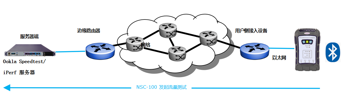 免費(fèi)的Ookla測速服務(wù)器主要分布在各個(gè)運(yùn)營商。為了更準(zhǔn)確地測試校園內(nèi)網(wǎng)的吞吐性能,建議在校園網(wǎng)內(nèi)架設(shè)Ookla 測速服務(wù)器?,F(xiàn)場人員用NSC-100發(fā)起流量測試,遠(yuǎn)端服務(wù)器在自動應(yīng)答狀態(tài)。