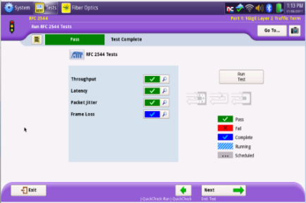 RFC2544測試和Y.1564測試,可以精確驗(yàn)證以太網(wǎng)鏈路的層2/3/4層性能 (10G/1G),主要用于網(wǎng)絡(luò)開通及驗(yàn)收測試。一般是斷業(yè)務(wù)型測試。RFC2544 專注于識別被測設(shè)備或網(wǎng)絡(luò)的最大性能極限。Y.1564 則傾向于測試網(wǎng)絡(luò)鏈路的多業(yè)務(wù)并行是性能是否滿足設(shè)計(jì)。該項(xiàng)測試需要Viavi公司的高級網(wǎng)絡(luò)綜合測試儀SC4800(或MTS5800)進(jìn)行配合。