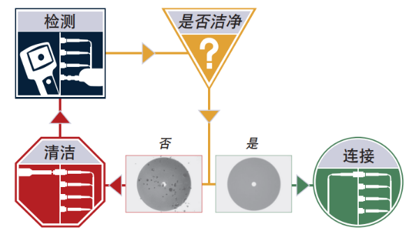 “先檢查后連接”是光纖網(wǎng)絡(luò)的最佳操作流程。故障和光網(wǎng)絡(luò)停機(jī)的首要原因是光纖連接受到污染。在使用只有幾微米寬的光纖時(shí),任何污染都可能造成災(zāi)難性的后果。遵循這個(gè)簡單的“先檢查后連接”流程,是確保光纖干凈連接的唯一方法。