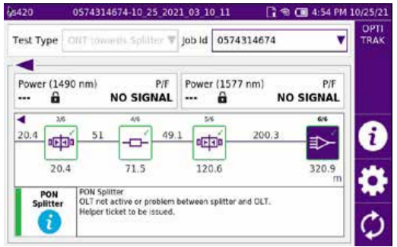 到 OLT 的連續(xù)性和分光器連接性檢查。Optimeter 可提供有關(guān)“無光”的可能根本原因的指導(dǎo), 例如光纖斷裂、分路器斷開或非活動/斷開的 OLT