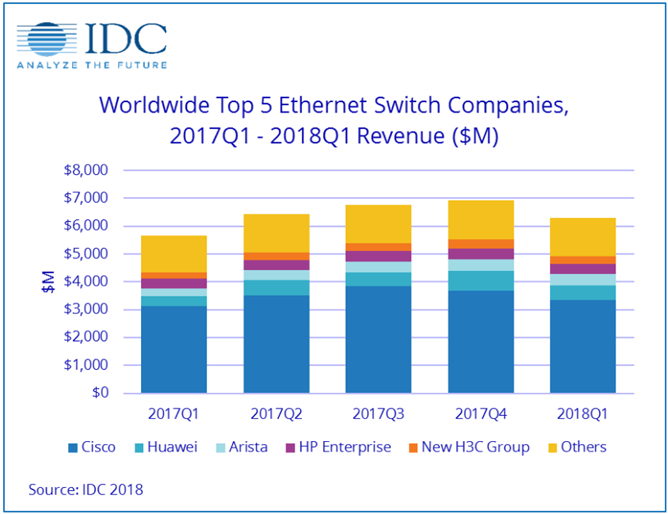 2017年,交換機市場在七年內(nèi)實現(xiàn)了最強勁的增長,并且由于持續(xù)的數(shù)據(jù)中心升級和擴張以及經(jīng)濟條件的改善,對園區(qū)設(shè)備需求不斷增長。2017年全球數(shù)據(jù)中心網(wǎng)絡(luò)設(shè)備收入總計137億美元,較2016年增長13%。根據(jù)IHS發(fā)布的報告顯示,以太網(wǎng)交換機市場同比增長了12%。該報告指出:2018年第一季度,全球以太網(wǎng)交換機收入總計61億美元,相較去年同比增長12%。