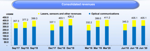 光通信銷售收入3.15億美元,同比增長4.89%,環(huán)比增長2.14%;激光器、傳感器及其他產品銷售收入9000萬美元,同比下滑13.96%,環(huán)比下滑12.28%。