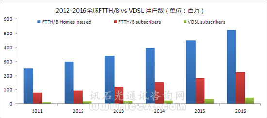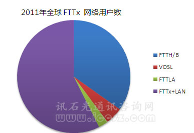 全球FTTx接入2011年繼續(xù)增長。到2011年年底,FTTx用戶已超過2.2億,2011下半年FTTx保持25%的增長。