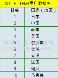 日本FTTH/B用戶數(shù)依舊保持世界第一,中國緊隨其后。但在增長上,這兩個國家則呈現(xiàn)出明顯不同。中國的表現(xiàn)更為積極, 2011年下半年較上半年增長44%,而日本僅有6%。這一趨勢只會變得更強(qiáng),因為在2011上半年,各自的增長率為14%和5%。這一趨勢將很快在擁有最多FTTH/B用戶數(shù)全球排名上,使得中國和日本調(diào)換位置。