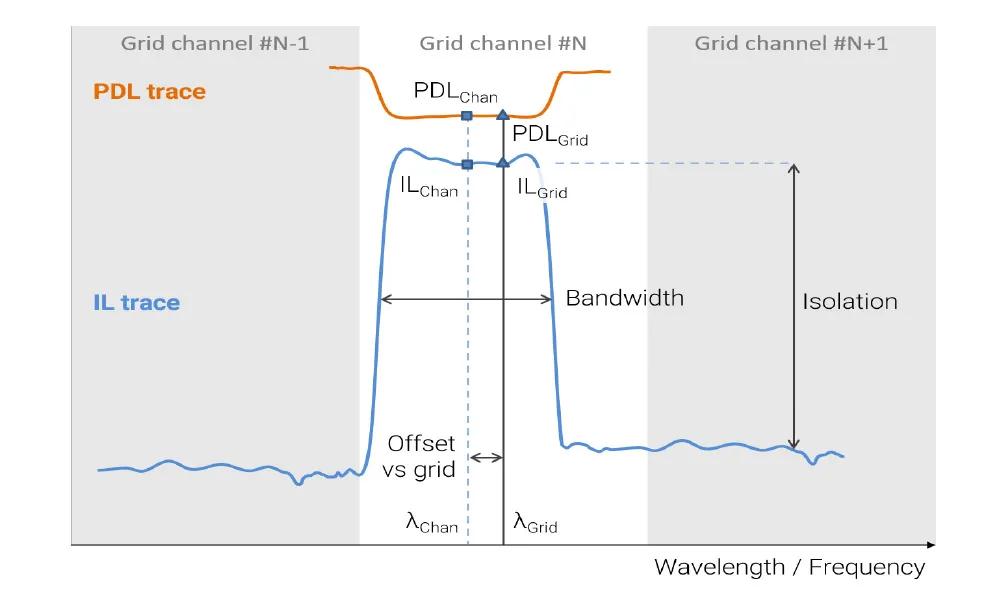 對于與波長高度相關(guān)的 WDM 器件來說,必須以很高的分辨率來測量 IL 和 PDL 隨波長的變化情況,從而獲得準(zhǔn)確的分析參數(shù),用于在驗(yàn)收測試報(bào)告里進(jìn)行通過/未通過分析,這些參數(shù)包括: