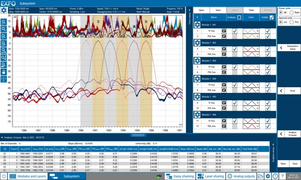 圖2:使用 CTP10 測試儀,對6通道100 GHz DWDM復(fù)用器/解復(fù)用器進(jìn)行 IL-PDL 掃頻測量。測量參數(shù):波長范圍1530-1620 nm,采樣分辨率1 pm,激光器掃描速度100 nm/s??倻y量時(shí)間為12.5秒。