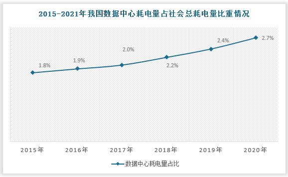 數(shù)據(jù)中心是公認(rèn)的高耗能行業(yè)。近年來(lái),中國(guó)數(shù)據(jù)中心行業(yè)整體用電量以每年超過(guò)10%的速度遞增,占全社會(huì)總耗電量比重逐年升高。2020年,數(shù)據(jù)中心行業(yè)耗電量更是突破2000億千瓦,約占全社會(huì)用電量的2.71%。