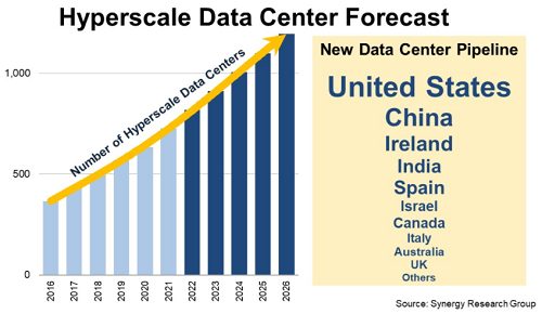 目前已在運營的超大規(guī)模數(shù)據(jù)中心中,美國占數(shù)量的近40%,占全球容量的一半。在很大程度上,未來它也是擁有最多新數(shù)據(jù)中心的國家,其次是中國、愛爾蘭、印度、西班牙、以色列、加拿大、意大利、澳大利亞和英國。隨著運營數(shù)據(jù)中心的安裝基數(shù)每年以兩位數(shù)的百分比持續(xù)增長,同時其平均規(guī)模的增加和舊設(shè)施的擴張,這些數(shù)據(jù)中心的容量將以更快的速度增長。