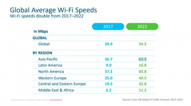 與此同時,和2017年相比,全球IP流量將在2022年增加3倍,從每月122艾字節(jié)增加到每月396艾字節(jié)。中東和非洲的增長率最高,為41%。預計到2022年,北美的全球平均Wi-Fi速度將達到83.8 Mbps,高于2017年的37.1 Mbps。思科預計,到2022年,非PC設備將占據(jù)全球IP流量的81%,2022年IP流量的最大份額將來自智能手機,占44%,而PC部分僅占此時IP流量的19%。