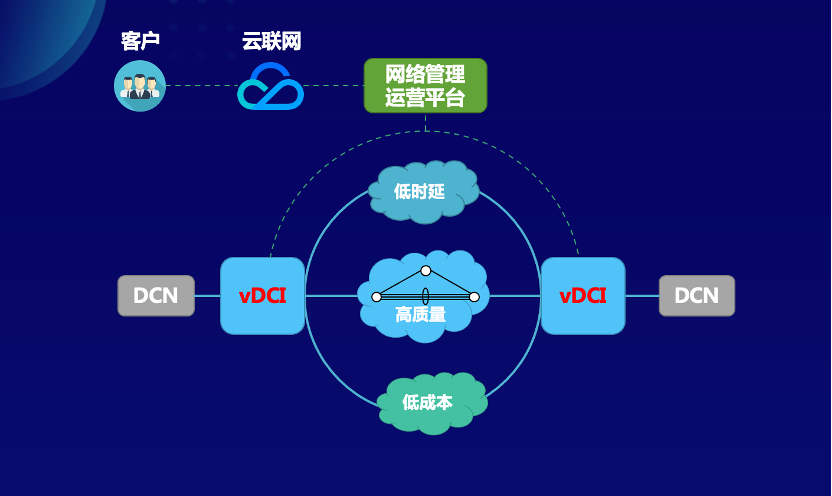 這是一張vDCI產(chǎn)品的落地場(chǎng)景圖,vDCI在接收到從數(shù)據(jù)中心發(fā)出的流量后,通過(guò)Overlay技術(shù)為每個(gè)客戶構(gòu)建一個(gè)獨(dú)立的專屬網(wǎng)絡(luò)平面,并在專用平面內(nèi)基于客戶的不同業(yè)務(wù)類型進(jìn)行精確匹配和靈活的按需調(diào)度,同時(shí)確保不同客戶間互不影響。