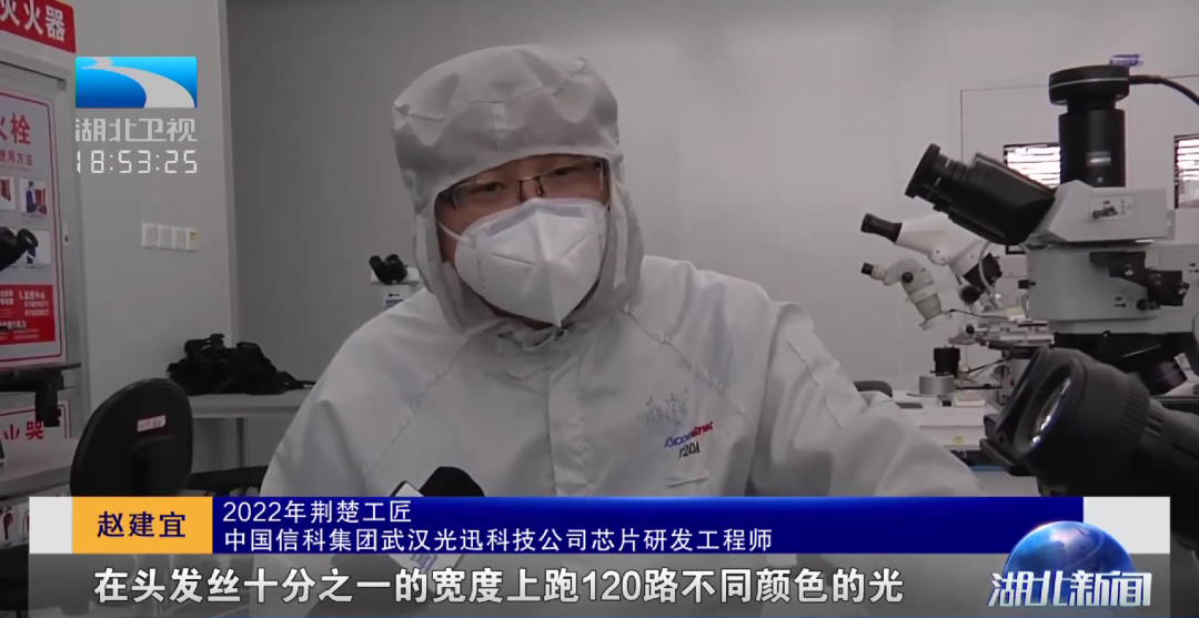 2022年荊楚工匠、中國(guó)信科集團(tuán)武漢光迅科技公司芯片研發(fā)工程師趙建宜:“芯片通光寬度僅有頭發(fā)絲的十分之一,10微米寬。在頭發(fā)絲十分之一的寬度上面跑120種顏色的光,相當(dāng)于我們的高速公路里面有120個(gè)車(chē)道,如何保證長(zhǎng)期穩(wěn)定運(yùn)轉(zhuǎn),這是我們的工藝難點(diǎn)。”