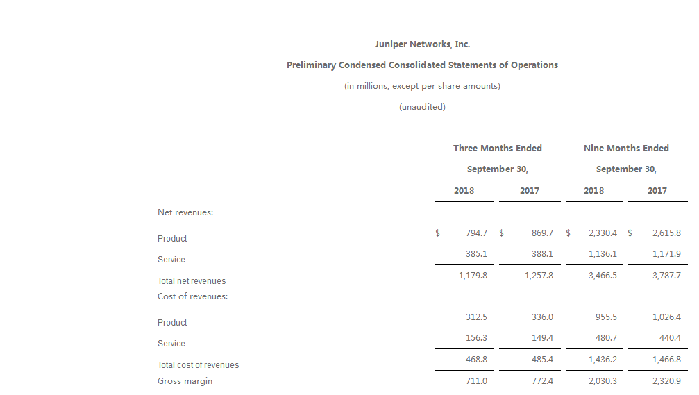 ICCSZ訊(編譯:Vicki)Juniper網(wǎng)絡(luò)(NYSE:JNPR)公布了截至2018年9月30日的初步財(cái)務(wù)業(yè)績(jī)。