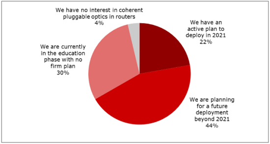 Heavy Reading調(diào)查研究表明,通信服務(wù)提供商(CSP) 不僅在評估新架構(gòu),而且還打算快速部署。近四分之一的受訪CSP已經(jīng)制定了在2021年部署相干可插拔器件的積極計劃,另有44%的CSP計劃在2021年之后進行部署。綜合這些反應(yīng),調(diào)查中三分之二的CSP打算在其路由器中融合相干可插拔光學(xué)器件。