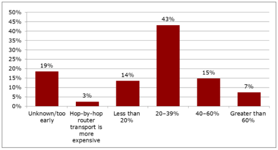 與傳統(tǒng)的基于轉(zhuǎn)發(fā)器的架構(gòu)相比,通過將400G相干可插拔光學(xué)器件融合到路由器上進行逐跳傳輸,您預(yù)計可節(jié)省多少TCO?