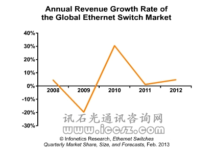 【訊石光通訊咨詢網(wǎng)】Infonetics最新報告顯示,2012年第四季度全球以太網(wǎng)交換機市場達到51億美元,環(huán)比增長5%;2012年全年該市場規(guī)模達到198億美元,年凈增近10億美元(或4.7%)。