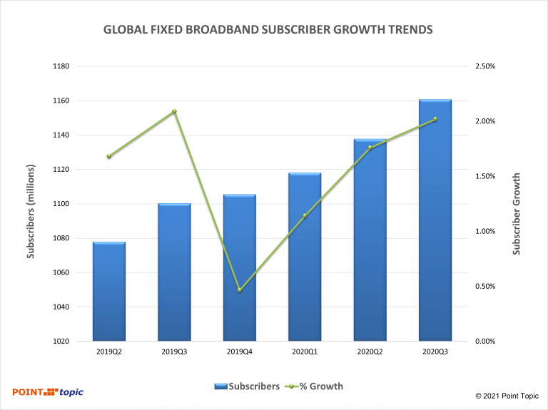 Figure 2. Global broadband subscribers and quarterly growth rates. Source – Point Topic.