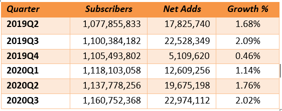 截止到2020年第三季度,寬帶固定寬帶用戶的季度增長率繼續(xù)上升,達到2%,連接數(shù)達到11.6億。