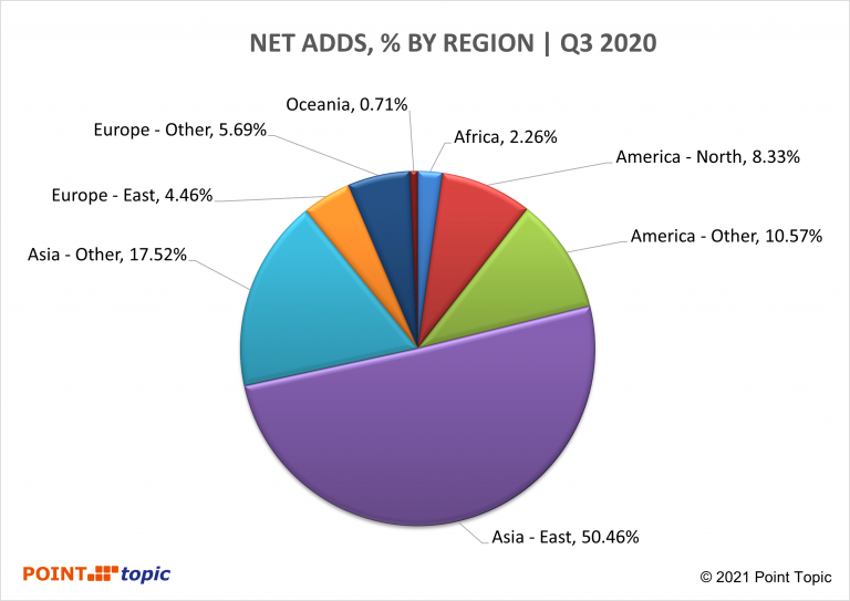 Figure 3. Share of net adds in fixed broadband subscribers by region. Source – Point Topic.