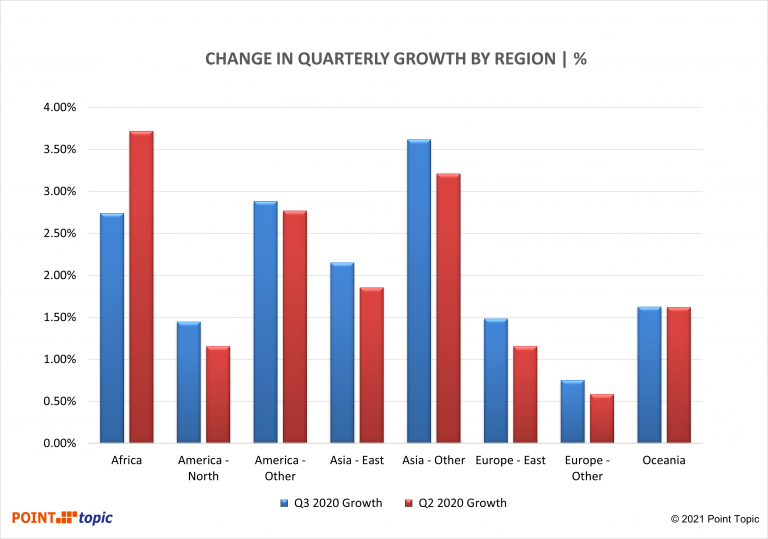 Figure 5. Quarterly growth in fixed broadband subscribers by region, Q3 2020 vs Q2 2020. Source: Point Topic.