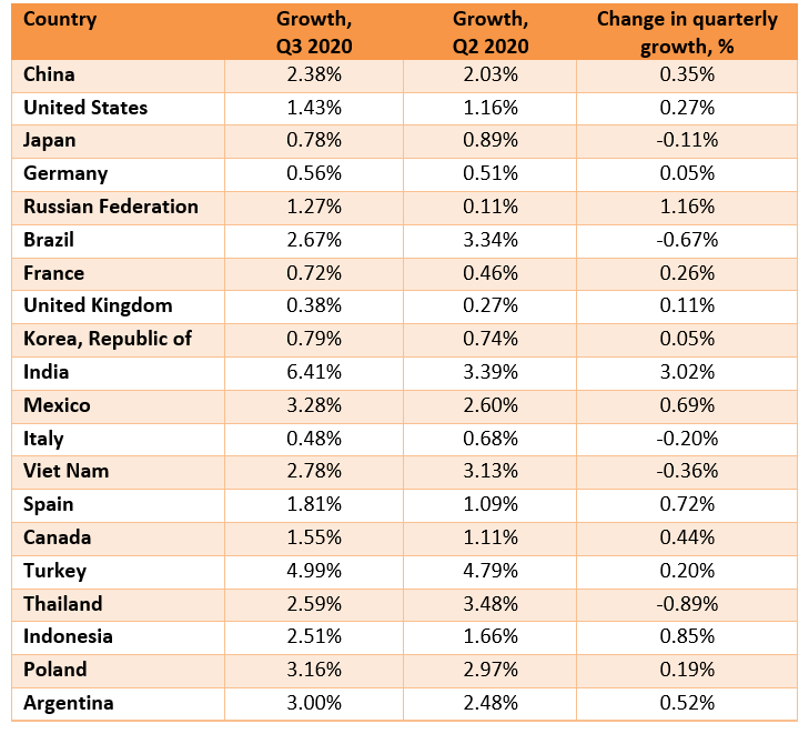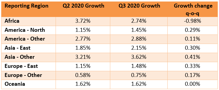 與上一季度相比,2020年第三季度,除非洲和大洋洲外,所有地區(qū)的增長率都更高。在亞洲,東歐和北美,差異尤為明顯。