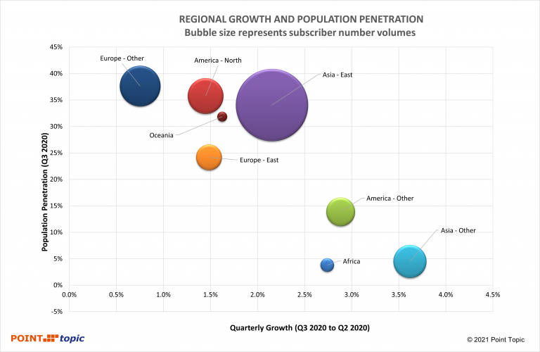 Figure 7. Penetration and quarterly growth by region (size of bubble represents subscriber volume in Q3 2020). Source – Point Topic.
