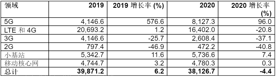 2020年無線基礎架構市場總營收將下滑4.4%,為381億美元。2019年通信服務提供商(CSP)對5G網(wǎng)絡基礎架構的投資占無線基礎架構市場總營收的10.4%。而這一投資比例在2020年將達到21.3%。(參見表1)