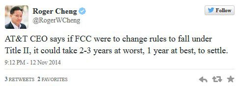 現(xiàn)在,AT&T已經(jīng)對奧巴馬提出的四項要求做出了實際的回應--將“暫停”其在美國境內(nèi)推廣的高速光纖互聯(lián)網(wǎng)服務。另外,AT&T CEO Randall Stephenson表示,如果FCC想要利用《通信法》第二章對寬帶服務重新歸類的話,那么它將要面臨各種各樣的法律挑戰(zhàn),對于這家機構(gòu)來說,如果情況好點,那么1年之間可以搞定,但如果情況糟糕,則需要兩三年的時間。
