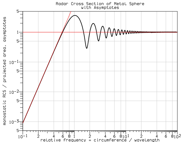 采用米氏散射理論計(jì)算的完美導(dǎo)電金屬球的 RCS 頻率函數(shù)(圖自:Catslash / 維基百科)