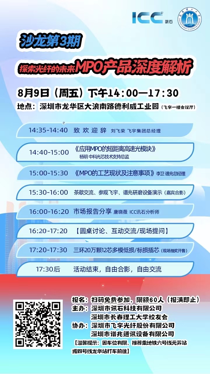2024年8月9日下午,ICC訊石沙龍第3期《探索光纖的未來—MPO產(chǎn)品深度解析》將圍繞MPO技術(shù)的產(chǎn)品結(jié)構(gòu)、產(chǎn)品生產(chǎn),以及MPO市場緊缺性、工藝創(chuàng)新性,結(jié)合應(yīng)用案例及最新進(jìn)展進(jìn)行互動探討。誠邀廣大光電連接器、網(wǎng)絡(luò)工程、技術(shù)解決方案及數(shù)據(jù)中心互聯(lián)專家及人士免費(fèi)報(bào)名參加,名額有限報(bào)滿即止哦。