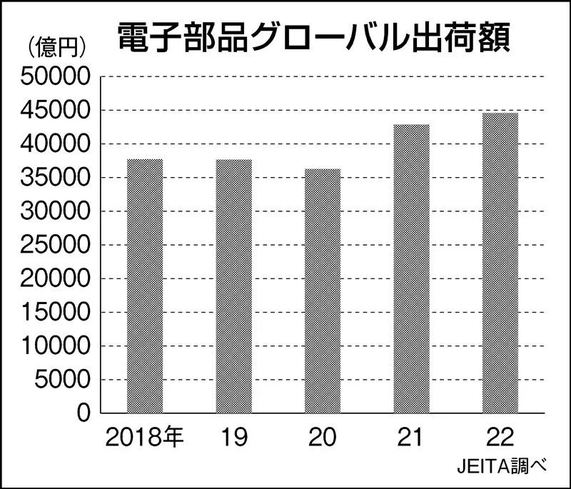 ICC訊 據(jù)日本電子信息技術(shù)產(chǎn)業(yè)協(xié)會(huì)(JEITA)統(tǒng)計(jì),2022年日本制造商電子元器件的全球出貨額為44575億日元,同比增長(zhǎng)4%。雖然創(chuàng)下了統(tǒng)計(jì)以來(lái)的歷史新高,但日元貶值的作用已經(jīng)顯著,換算成美元將跌破上年水平。