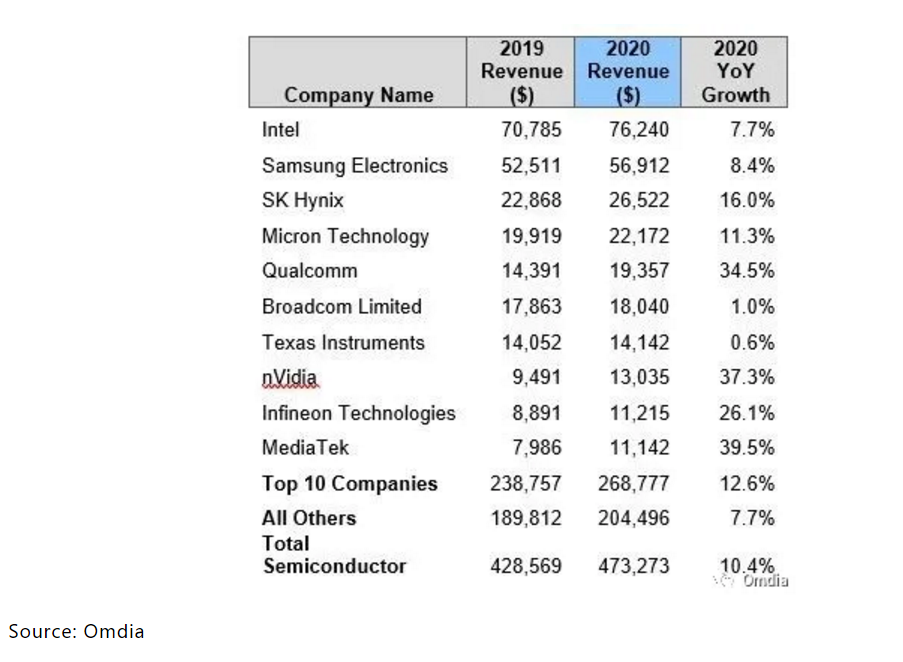 ICC訊 Omdia在2020年四季度發(fā)布的《Semiconductor Competitive Landscape Tool (CLT)》中報(bào)告稱,2020年半導(dǎo)體行業(yè)營(yíng)收比2019年增長(zhǎng)10.4%,達(dá)到4733億美元。