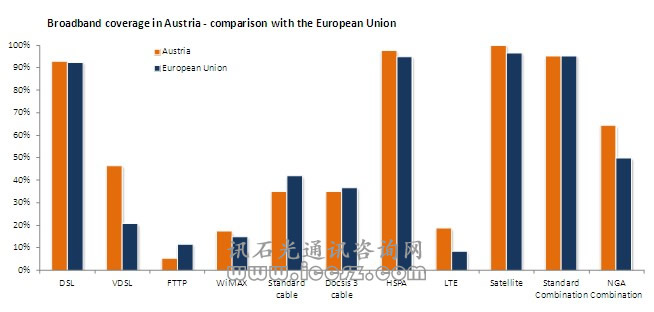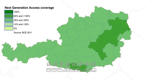 《2011歐洲寬帶覆蓋》調(diào)研報告顯示,95%的奧地利家庭能夠使用基本的寬帶,也就是說,只要他們想用,就可以獲得至少144kbps。超過64%的已經(jīng)可以使用超高速寬帶(也成為NGA,即下一代接入)。在調(diào)研的29個國家中(歐盟27國和挪威、冰島),96%能夠獲得基本寬帶,超過50%(一半國家走向2020數(shù)字天堂目標(biāo))能夠獲得超高速。