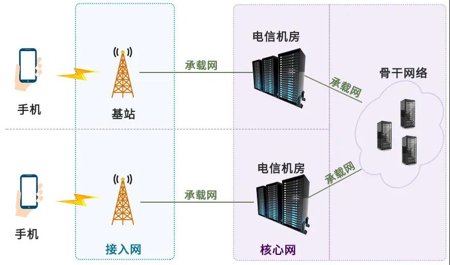 5G網(wǎng)絡(luò)分為三個(gè)部分,分別是接入網(wǎng)、承載網(wǎng)和核心網(wǎng)。他們之間關(guān)系的理解,可以參照下面這張圖:
