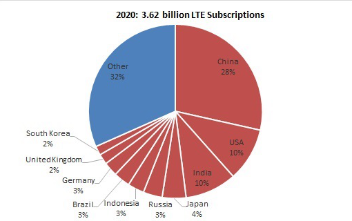 (LTE用戶國家分布,2020年)