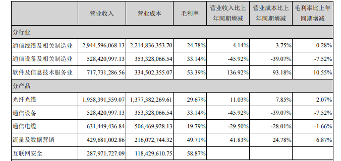分產(chǎn)品來看,光纖光纜營收19.58億元,同比增長11.03%;通信設(shè)備營收5.28億元,同比下降45.92%;通信電纜營收6.31億元,同比下降29.5%;流量及數(shù)據(jù)營銷營收4.3億元,同比增長41.83%。