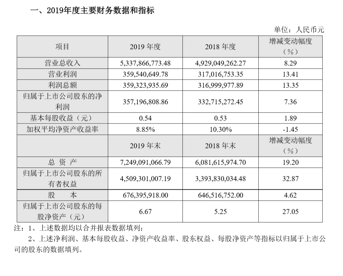 2019年公司積極拓展產(chǎn)品和市場增量,不斷提質(zhì)增效,主營業(yè)務(wù)保持穩(wěn)步增長,與2018年度相比,營業(yè)收入同比增長8.29%,營業(yè)利潤同比增長13.41%,利潤總額同比增長13.35%,歸屬于上市公司股東的凈利潤同比增長7.36%,實現(xiàn)基本每股收益0.54元,較上年同期上升1.89%。