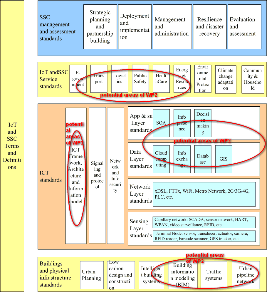 由于這個(gè)圖是在原來智慧城市與可持續(xù)發(fā)展焦點(diǎn)組(ITU-T Focus Group on Smart and Sustainable Cities)智慧城市路線圖的基礎(chǔ)上綜合了IoT研究方向而形成的,存在一個(gè)比較明顯的問題,就是沒有將IoT和智慧城市的關(guān)系在圖上進(jìn)行清晰的表達(dá),同時(shí)也沒能將原來ICT的范圍和IoT進(jìn)行區(qū)分。這樣在日后的工作中留下了沖突的可能性。