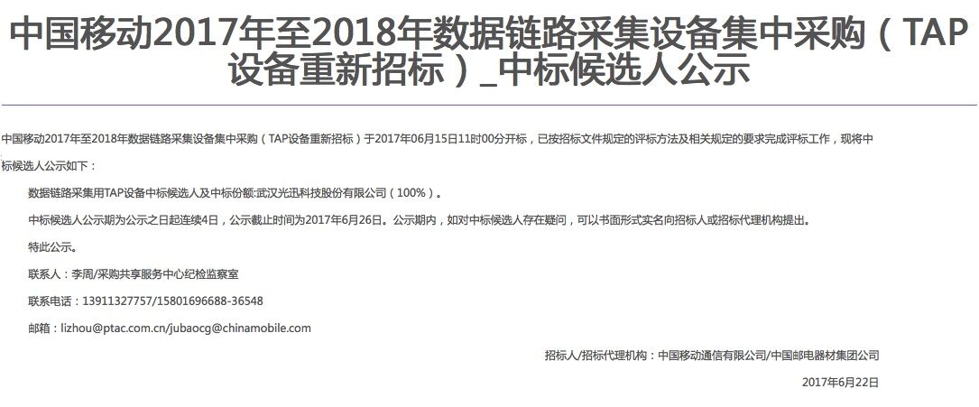 ICCSZ訊 今日,中國(guó)移動(dòng)公布2017-2018年數(shù)據(jù)鏈路采集設(shè)備(TAP設(shè)備)重新招標(biāo)結(jié)果,武漢光迅科技股份有限公司獲得100%份額。