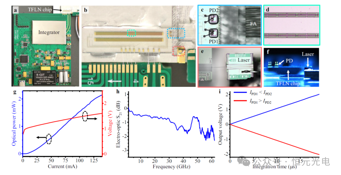 圖2 封裝設(shè)備的原型。a整個設(shè)備的照片。b混合集成芯片的顯微照片。c–e分別是倒裝芯片光電探測器(PD)、調(diào)制器行波電極和激光器的放大顯微照片。f設(shè)備側(cè)視顯微照片。g從激光器耦合到TFLN芯片中的光的光電流-電壓曲線。h調(diào)制器的電光帶寬(S21參數(shù))。i當(dāng)輸入光功率固定在一定值時,光接收器的輸出電壓隨積分時間而變化。